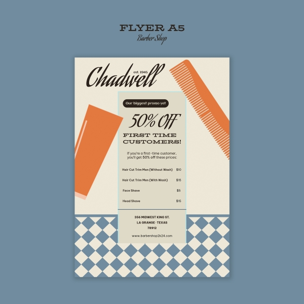 Very simple and creative style barber shop discount A5 flyer design is suitable for barber shop discount flyer design